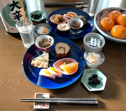 朝体重:45.0kg今日は箱根駅伝往路をテレビでみながら、酒宴。スモークサーモンの下にはたっぷりの紅白なます、リーフレタス・セロリの葉・プチトマト···